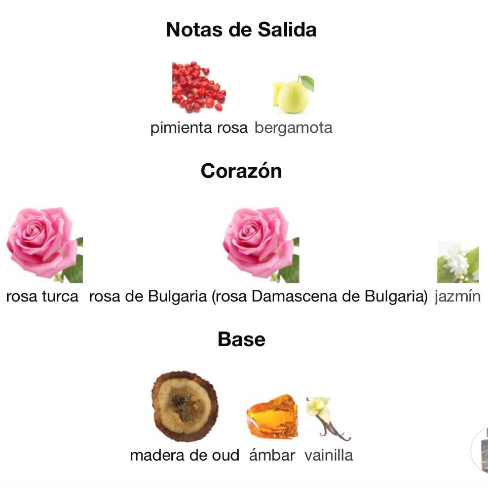 - Notas de Corazón: Peonía, Caramelo, Madera de Oud.