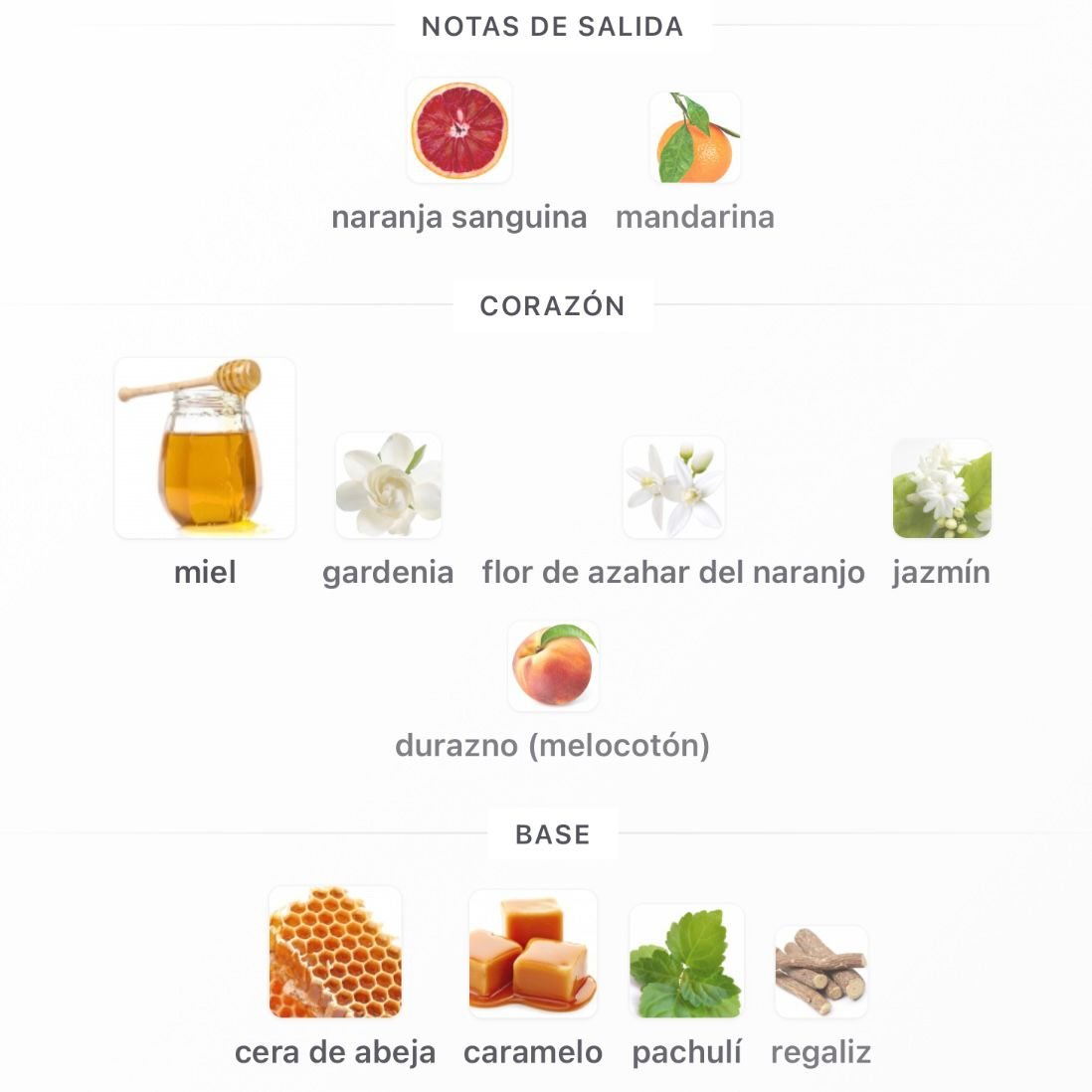 – Notas de Corazón: miel, gardenia, jazmín, flor de azahar del naranjo y durazno